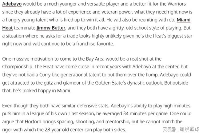 显然如果想得到阿德巴约,勇士必然需要付出巨大代价,由于霍福德刚签约,所以两名年轻中锋杰克逊-戴维斯和波斯特,大概率会送走其中一位。当然这肯定还不够,勇士还需要送出其他一些轮换,再加上选秀权作为回报,才能说服热火放人。当然如果勇士还想趁着库里没退役,再争取冲击总冠军的话,全力梭哈阿德巴约也没什么问题。尤其从理论来说,他可以跟追梦格林完美互补,两人体型和球风非常像,都十分擅长策应跟防守,当然阿德巴约正处于壮年,自主进攻能力也要强出一些。